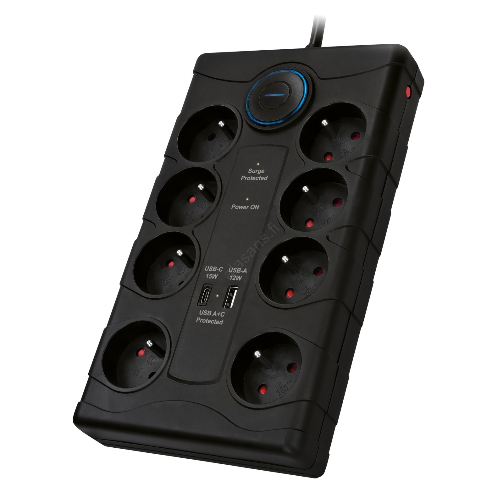 • LED-ilmaisimet: ylijännitesuoja aktiivinen, 230 V -pistorasiat suojatut, USB A + C -portit suojatut.