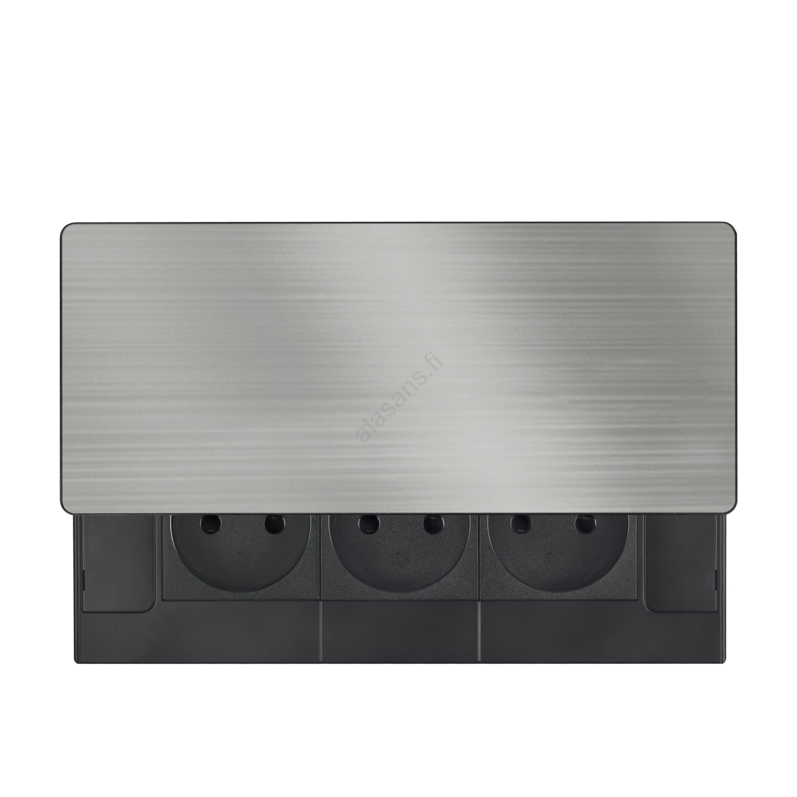 • Kansi on mattapintaisesta tummasta ruostumattomasta teräksestä (inox) ja siinä on liukuva mekanismi, joka suojaa pistorasioita pölyltä ja lialta.