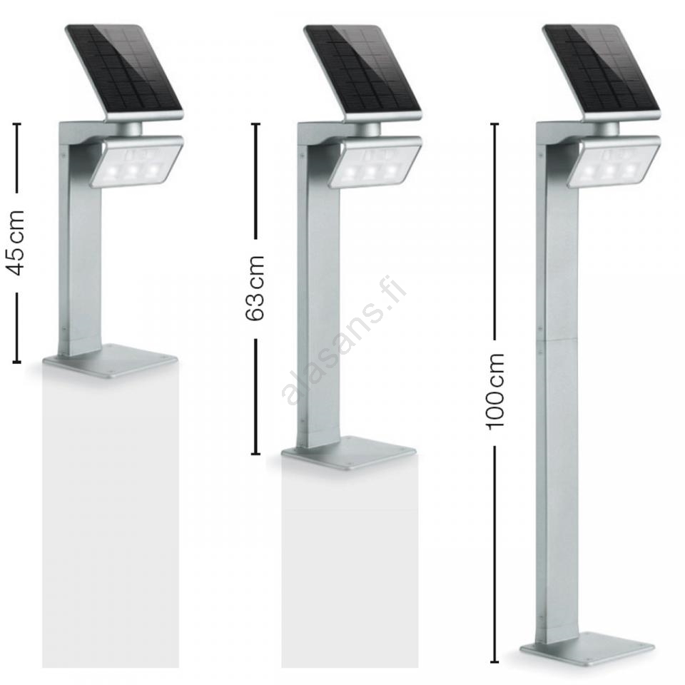 XSolar GL-S -anturi-LED-valaisin on maailman tehokkain LED-aurinkovalaisin – ja yksi kauneimmista. Kirkas valo, 365 yötä vuodessa, ilman sähkökustannuksia. Ihanteellinen sijoitettavaksi polun, ajoväylän, terassin tai puutarhan läheisyyteen – kaikkialle, missä sähköä ei ole saatavilla. XSolar GL-S -valaisimen korkeus on säädettävissä jaettavan pylvään ansiosta joustavasti tarpeen mukaan. Valittavana on korkeus 45 cm, 63 cm tai 100 cm. Tämä joustavuus yhdistyy LED-tekniikan, liiketunnistimen, aurinkopaneelin ja tehokkaan akun yhdistelmään. XSolar GL-S on vaikuttava sekä ulkoa että sisältä – niin muotoilultaan kuin erityisesti teknologialtaan: 0,5 W LED-valojärjestelmä, jonka vaikuttavuus on huikeat 124 lm/W, on 12 kertaa tehokkaampi kuin perinteiset hehkulamput ja valaisee tasaisesti jopa 30 m2 alueen. Steinelin LED-diodit kestävät noin 50 000 tuntia eli noin 30 vuotta, joten huoltoa ei tarvita. Tämä tarkoittaa: et koskaan enää vaihda lamppuja!