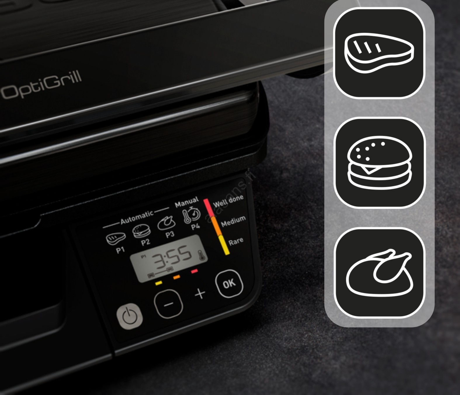 • Kolme automaattista ohjelmaa (punainen liha, burgerit, siipikarja) + manuaalitila oman lämpötilan ja ajan asettamista varten.