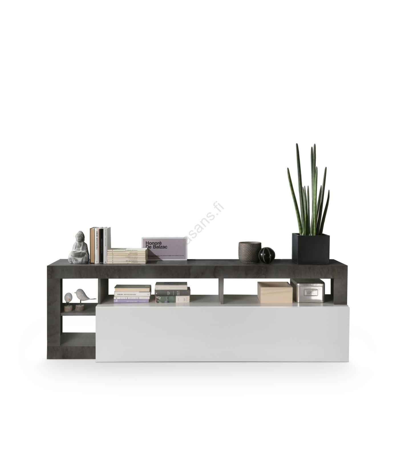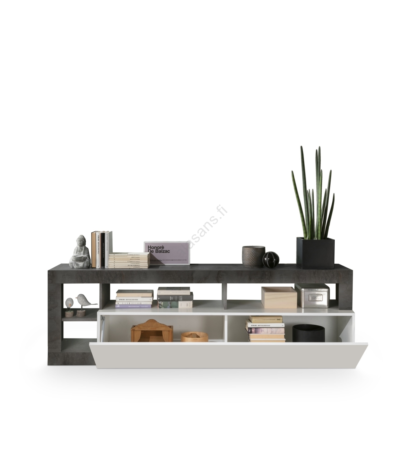 • Alalokero ja avoimet hyllyt tarjoavat tilaa kirjoille, koristeille ja kodin tarvikkeille.