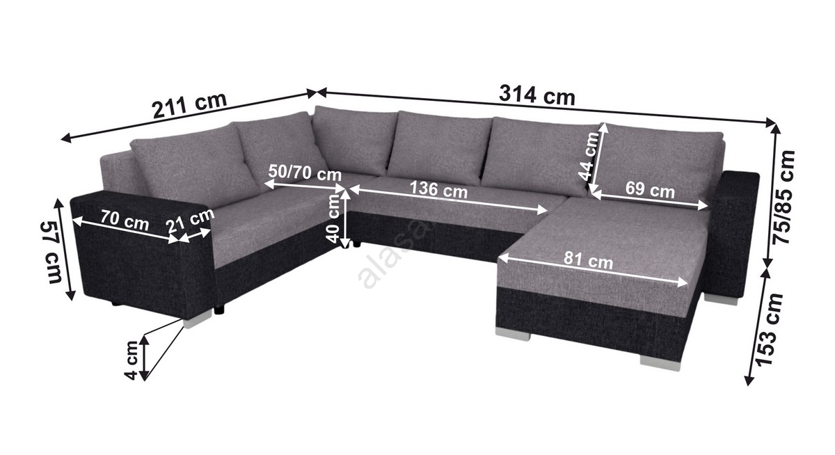 • Verhoiltu monikäyttöinen U-muotoinen avattava sohvasarja YORK harmaa/musta