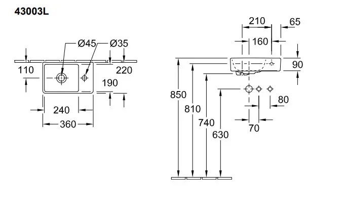 Villeroy & Boch 43003L01 - Seinään asennettava pesuallas AVENTO 36x22 cm keraaminen/valkoinen | Alas