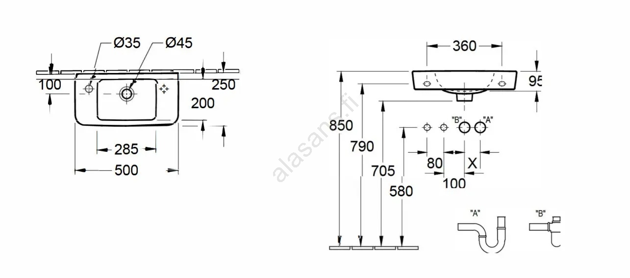 Villeroy & Boch 4342L501 - Seinäkiinnitteinen pesuallas O.NOVO 50x25 cm keramiikka/valkoinen | Alasa