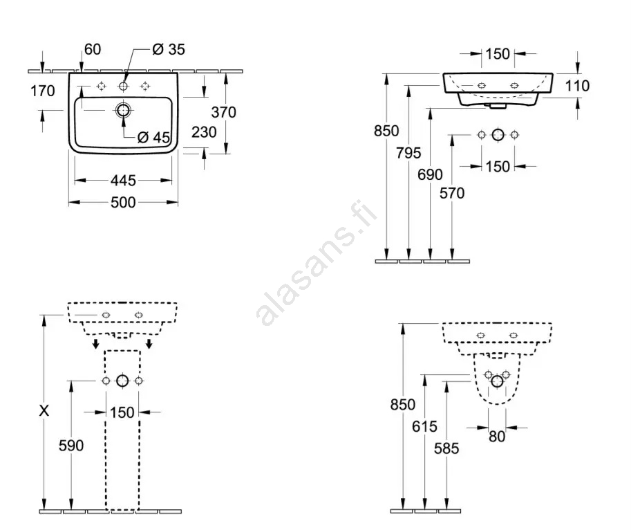 Villeroy & Boch 43445001 - Seinään asennettava pesuallas O.NOVO 50x37 cm keraaminen/valkoinen | Alas