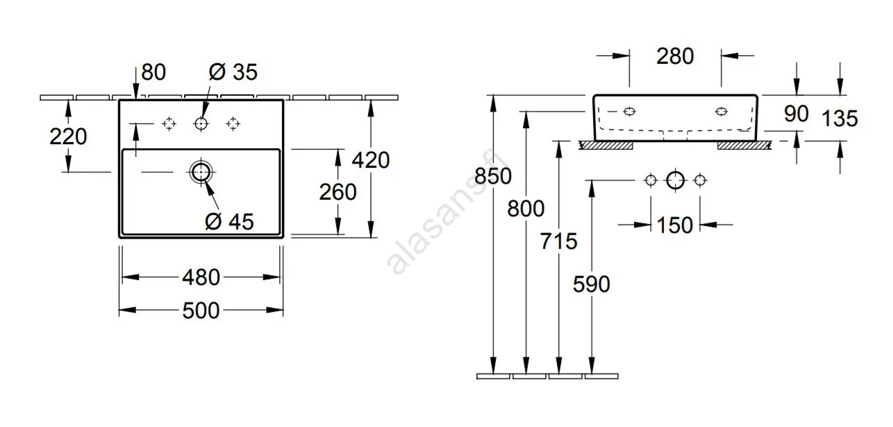 Villeroy & Boch 4A225G01 - Seinään asennettava pesuallas MEMENTO 50x42cm keraaminen/valkoinen | Alas