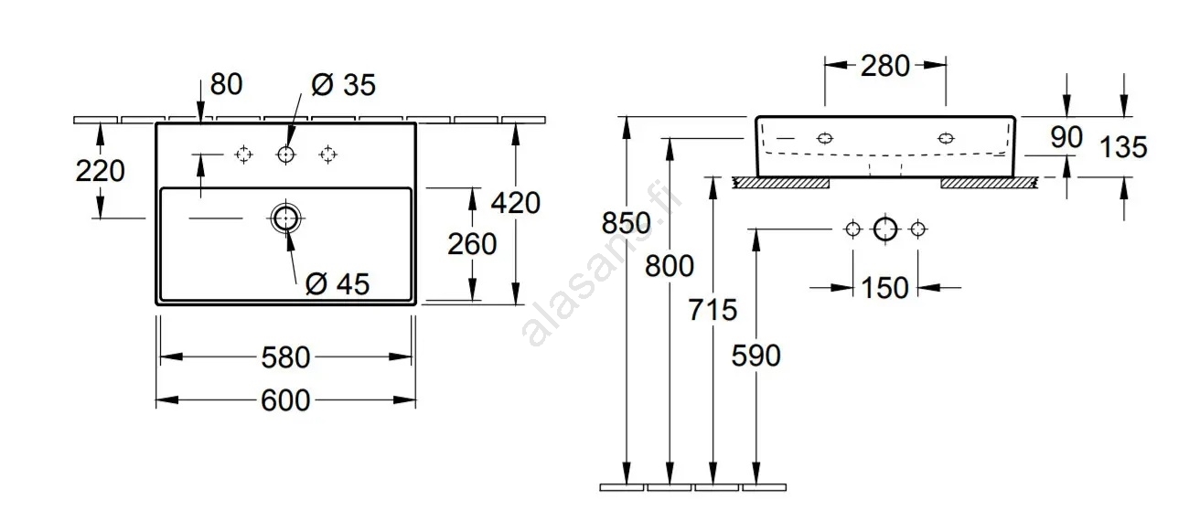 Villeroy & Boch 4A226G01 - Seinään asennettava pesuallas MEMENTO 60x42 cm keraami/valkoinen | Alasan
