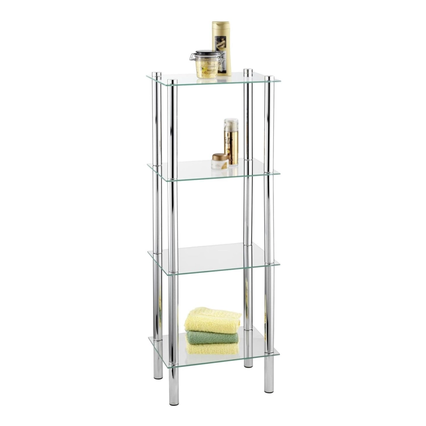 • Tyylikäs kylpyhuonehylly, jossa on neljä turvalasista hyllyä.