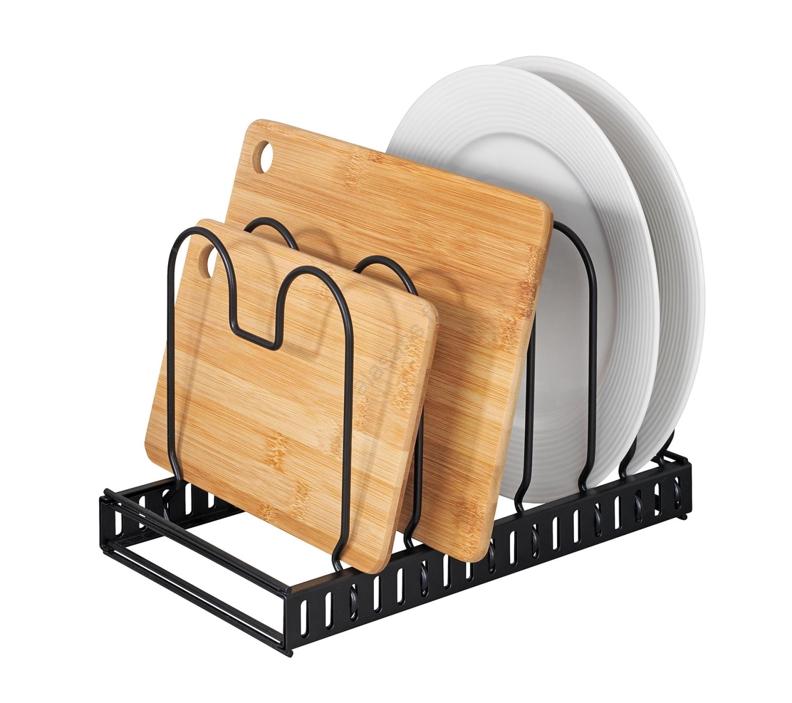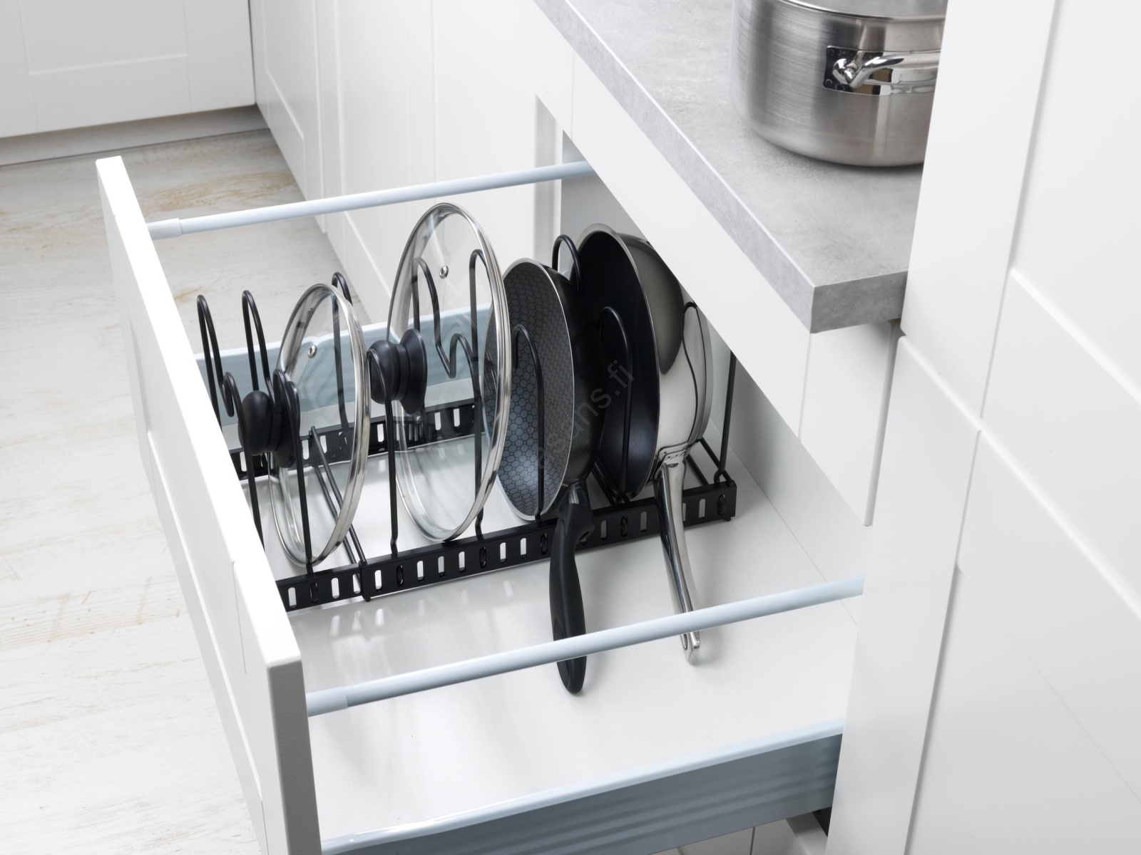 • Mahdollistaa tilaa säästävän ja selkeän säilytyksen kansille, pannuille, uunipelleille ja leikkuulaudoille.