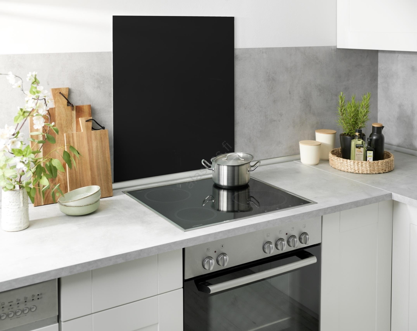 • Elegantti musta lasipaneeli antaa keittiölle modernin ilmeen.